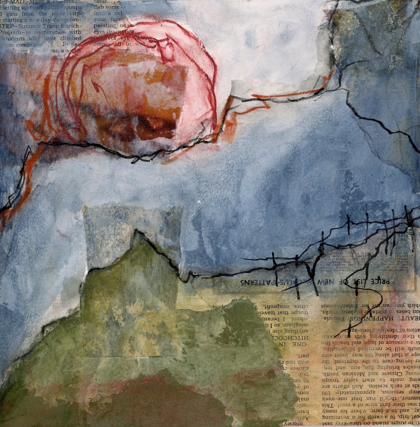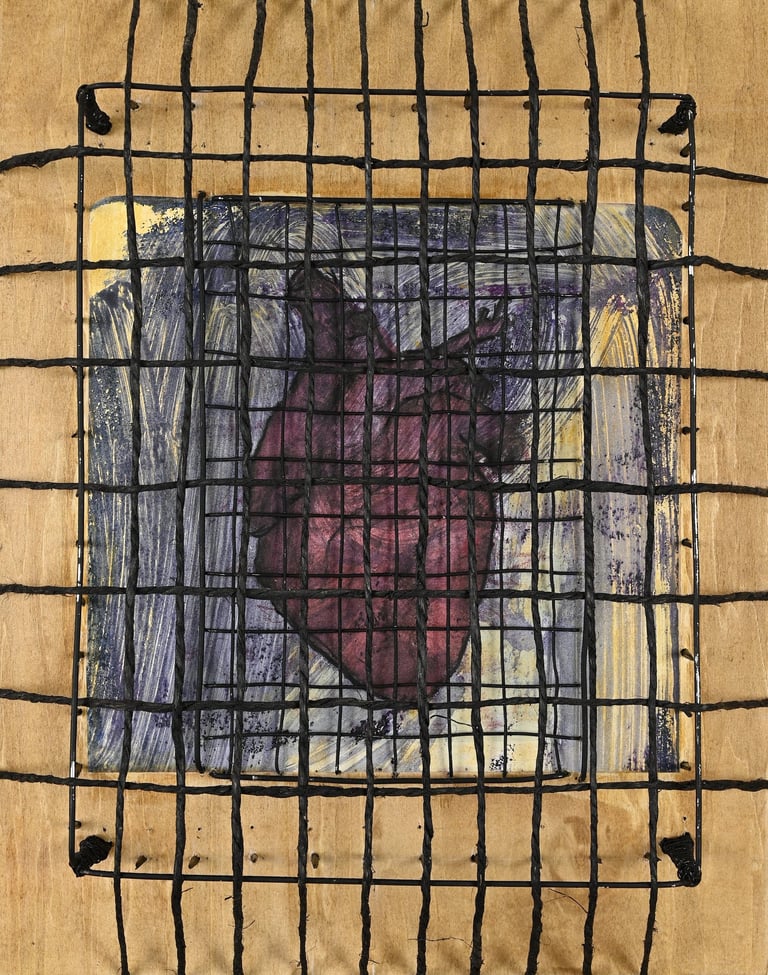 Acrylic Paint, wire and yute assemblage on wood panel.